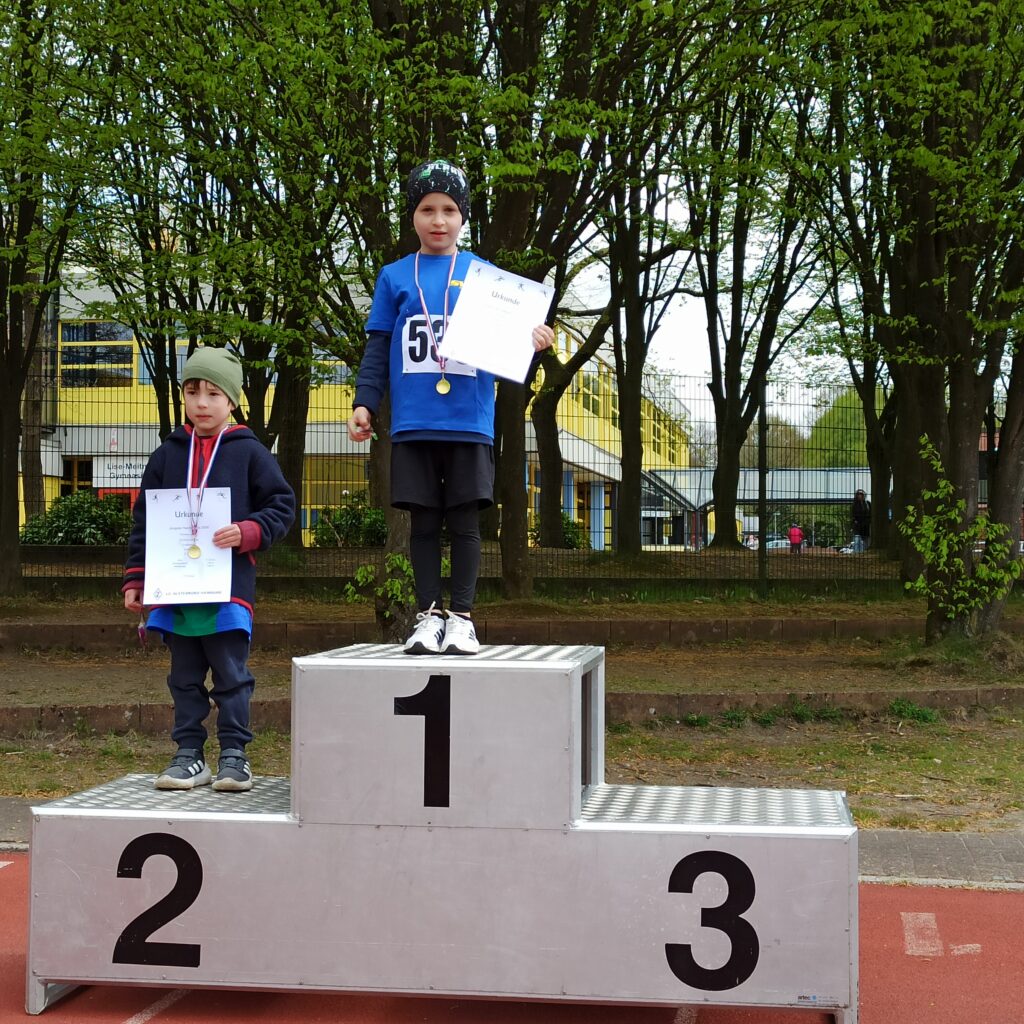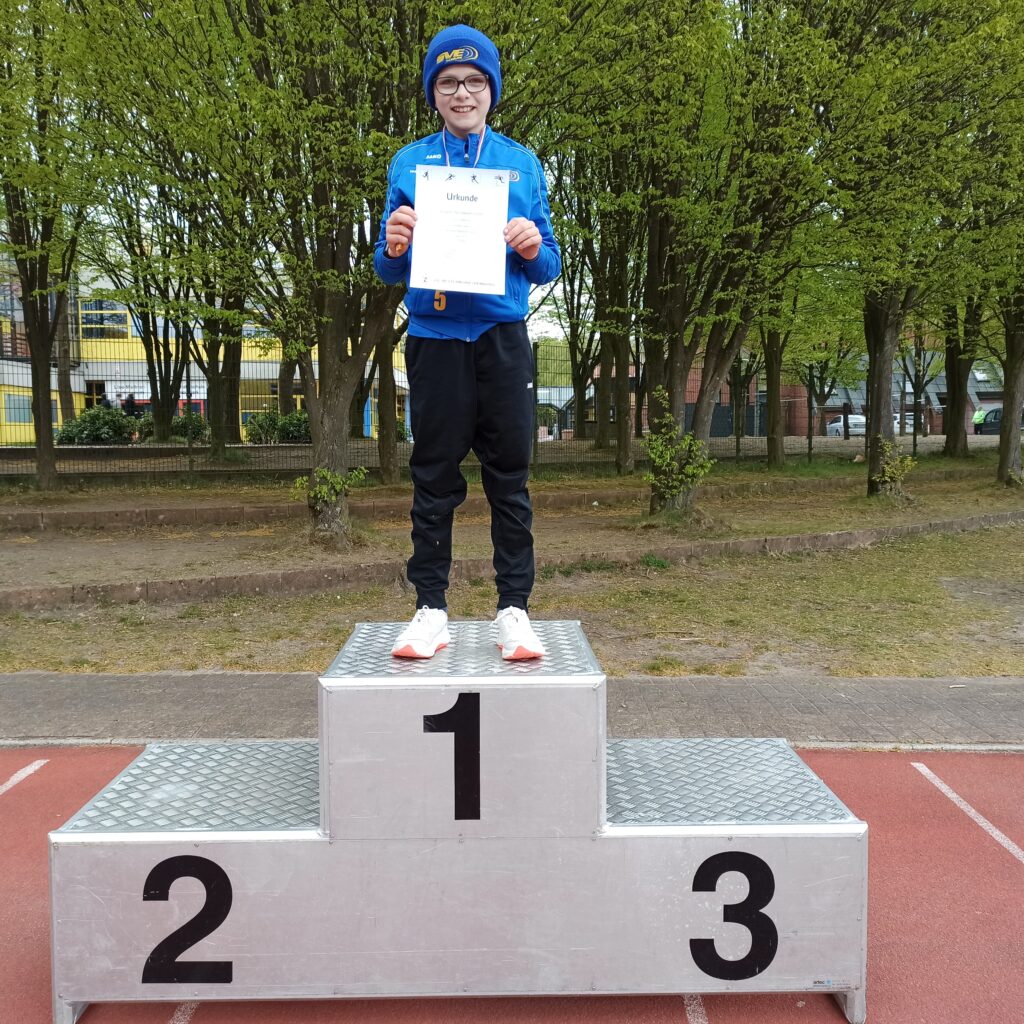 Gleich um 9:30 Uhr ging es mit den kleinsten Kindern und dem ersten Sieg für den SVE los. Maxim Funk gewann in seinem ersten Wettkampf die Konkurrenz im Dreikampf (50 m Sprint, Weitsprung, Ballwurf) der M6 mit 231 Punkten. In der nächsten Altersklasse, der M7, stand mit Fiete Martens ebenfalls ein SVE-Athlet mit 472 Punkten und persönlichen Bestleistungen in allen drei Disziplinen ganz oben auf dem Treppchen. Auf dem 5. Platz der M7 landete, ebenfalls mit guten Leistungen, Rishiv Karthik Kalyan. Bei den Mädchen der M7 verpasste Finja Meier in ihrem ersten Wettkampf mit tollen 328 Punkten und einen vierten Platz nur ganz knapp das Treppchen.